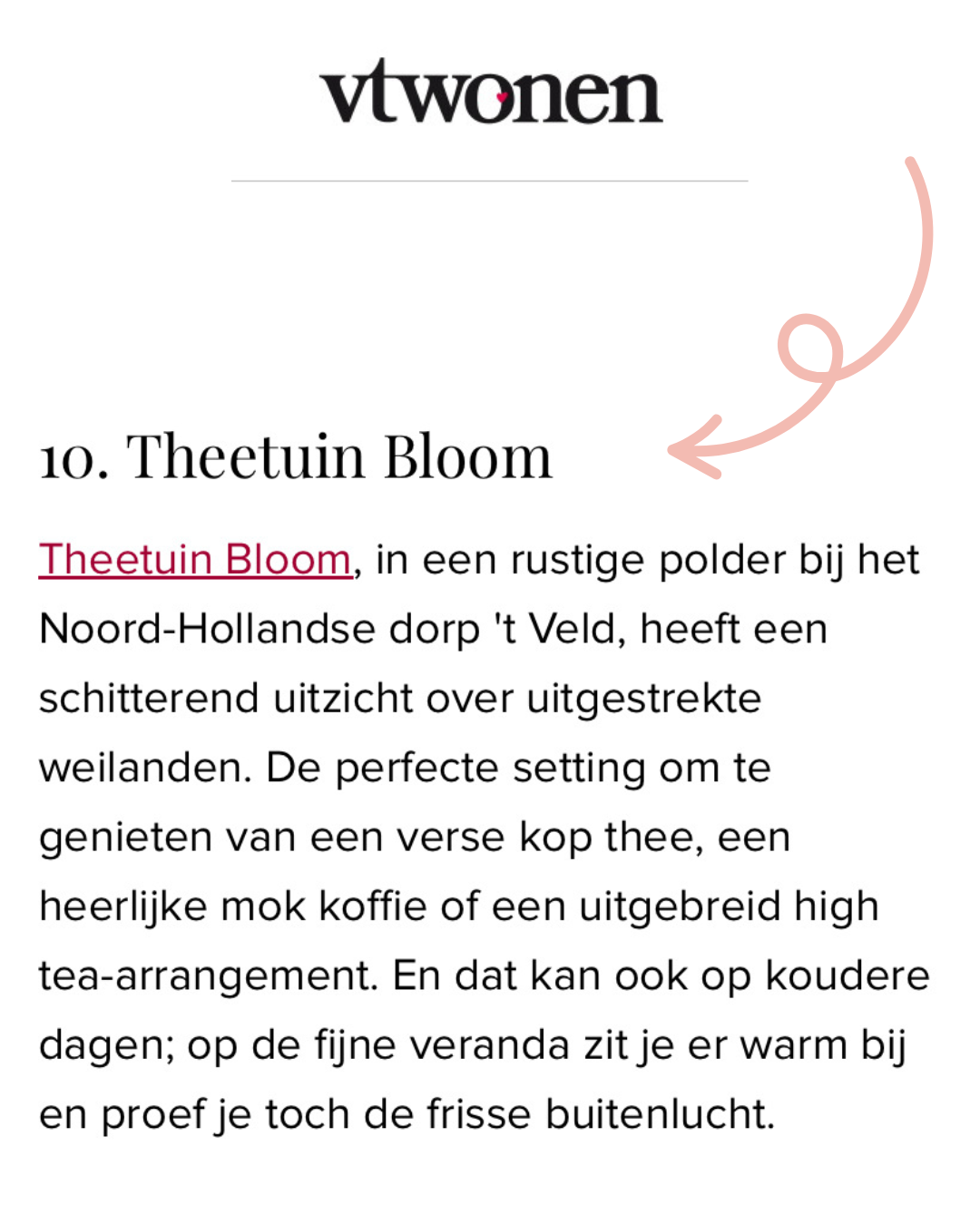 Wat blijft het bijzonder om onze Theetuin Bloom terug te zien in de media! Elke vermelding voelt als een compliment en laat zien hoe onze theetuin wordt beleefd. Hieronder vind je een overzicht van artikelen en publicaties waar we met plezier en trots op terugkijken.